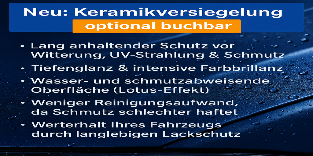 Wir freuen uns, Ihnen mitteilen zu können, dass wir ab sofort aufgrund der hohen Nachfrage auch Keramikversiegelungen sowie Geschenkgutscheine anbieten! Mit unserer hochwertigen Keramikversiegelung schützen Sie Oberflächen effektiv und langanhaltend, während unsere Geschenkgutscheine das perfekte Geschenk für jeden Anlass sind. Schauen Sie gerne vorbei oder kontaktieren Sie uns für weitere Informationen